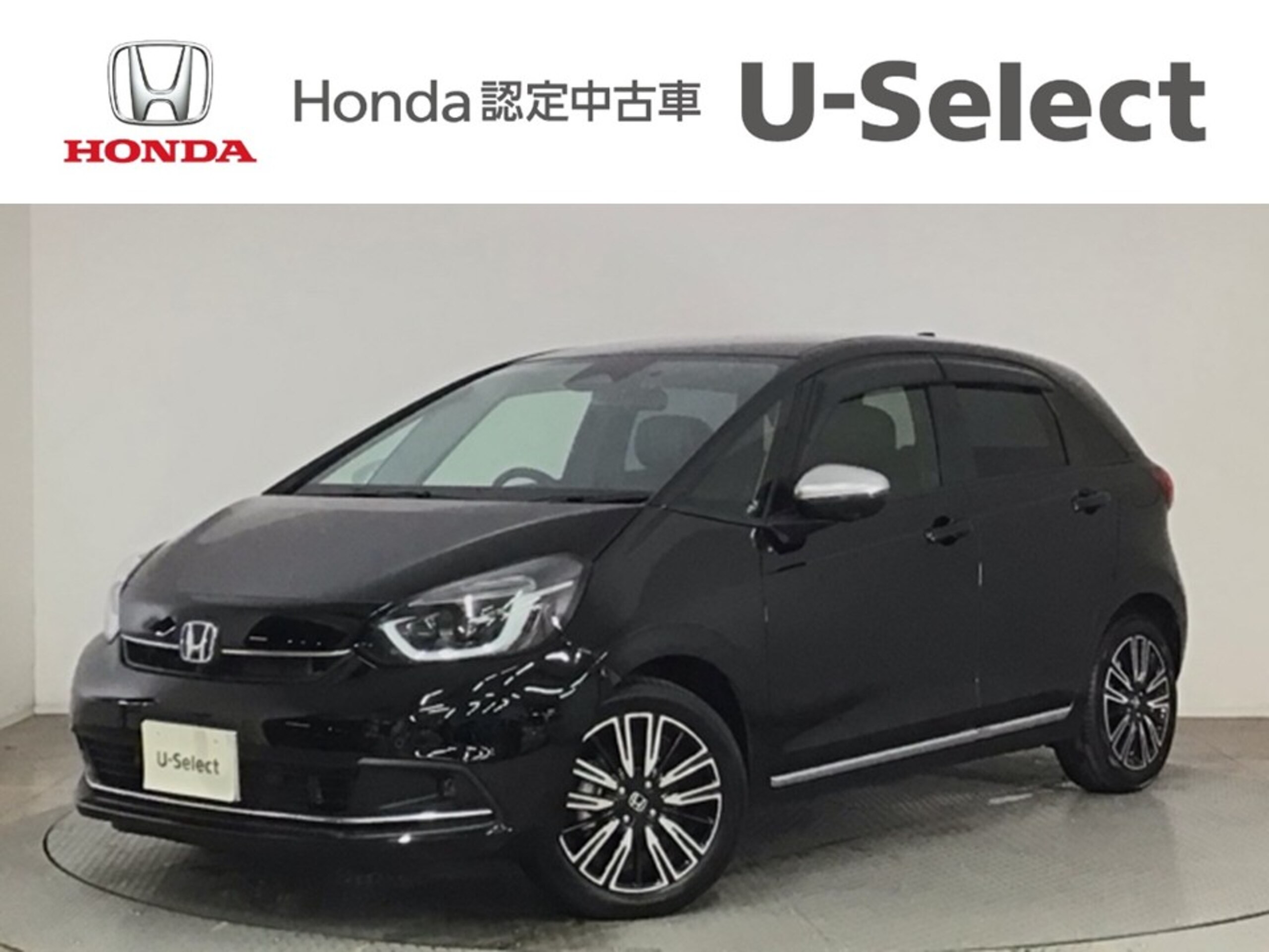 This is a Honda Fit 1.5 e:HEV Luxe demo car equipped with LED lighting, a full-segment digital TV tuner, a memory navigation system, genuine alloy wheels, and Honda CONNECT. It features the efficient e:HEV hybrid powertrain and is finished in Crystal Black Pearl.