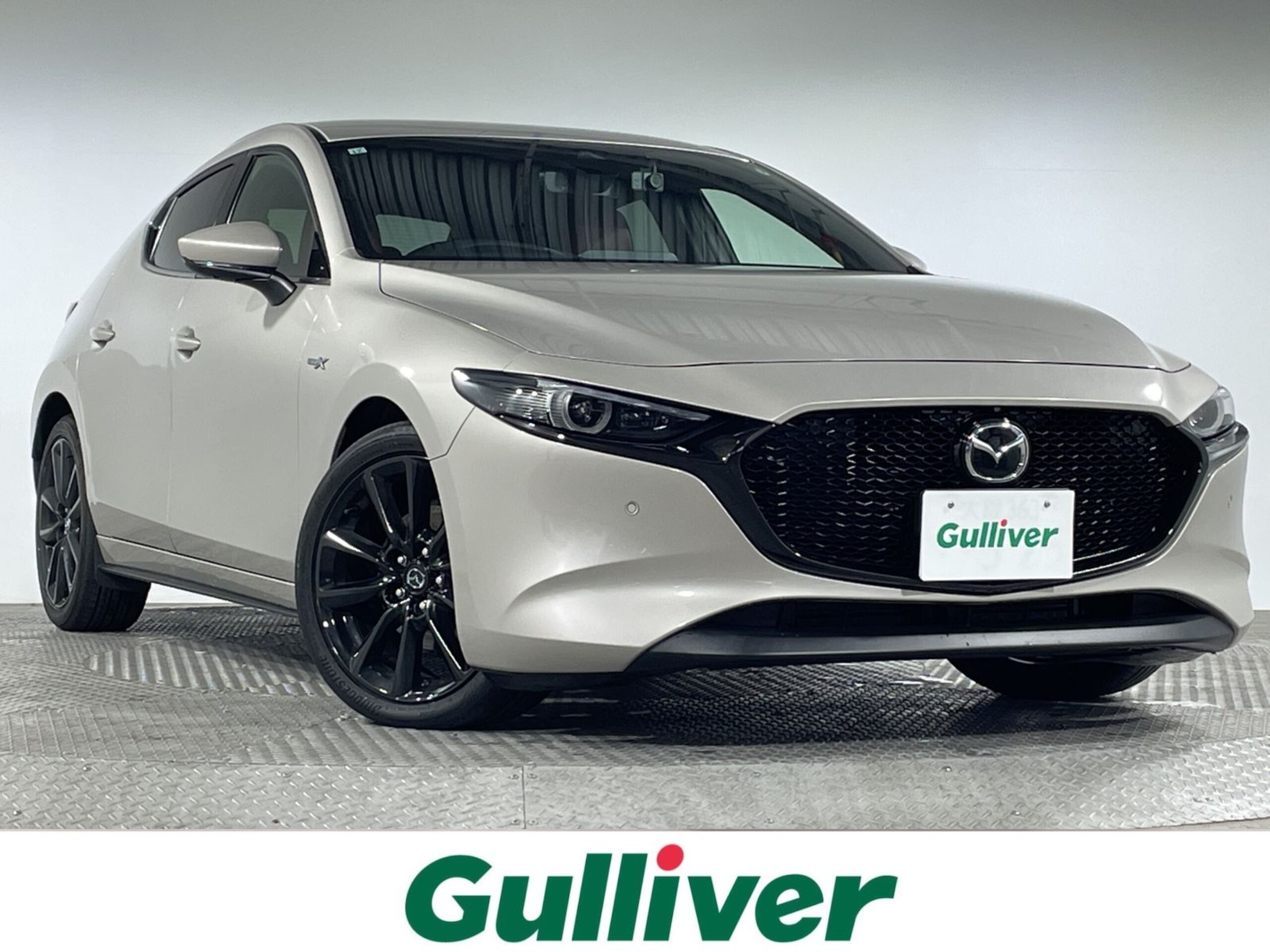 This Mazda3 Fastback features a 2.0-liter engine with 4WD and the Burgundy Selection trim. It is equipped with Mazda Connect 8.8-inch SD navigation, a Bose audio system, i-ACTIVSENSE safety suite, and a 360-degree safety package. Additional highlights include full-seg TV, CD/DVD player, ALH headlights, red leather seats with a power driver's seat and memory position, and heated seats and steering wheel.