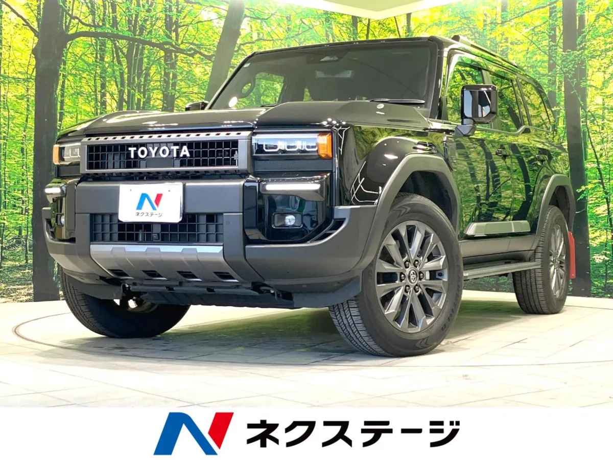 This is a non-smoking Toyota Land Cruiser 250 ZX grade with a 2.8-liter diesel turbo engine and 4WD. Key features include a sunroof, a genuine 12.3-inch navigation system with JBL sound, a 360-degree camera, collision mitigation, radar cruise control, genuine leather seats, front and middle seat air conditioning, a power tailgate, wireless charging, ETC, and a dashcam.